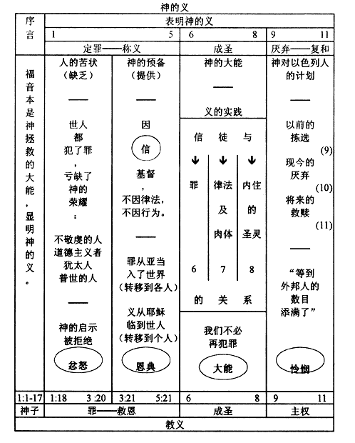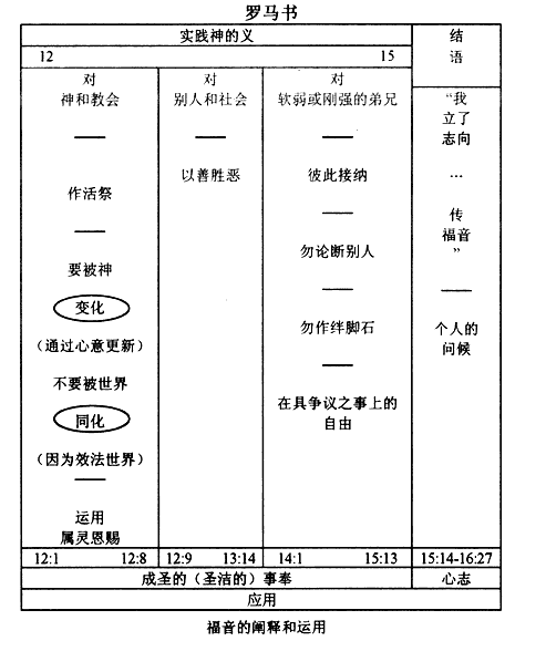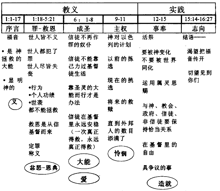 注:罗马书有两大基本部分,就是教义部分 1-11章和实践部分12-16章。这两部分可再细分为这六个主要部分。